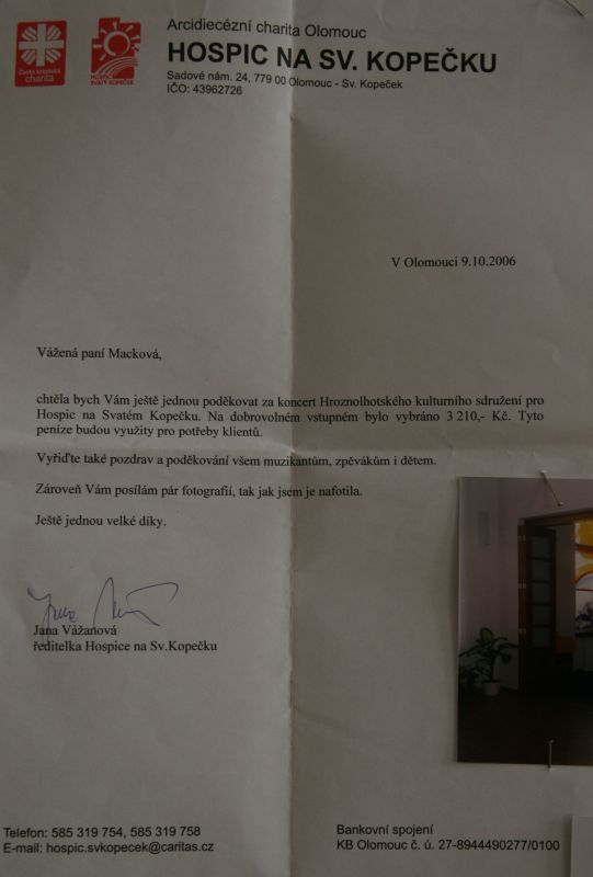 Ženský sbor z Hroznové Lhoty ctí, že se snaží pomáhat těm, kteří naši pomoc potřebují - v tomto případě Hospicu na Svatém kopečku u Olomouce.