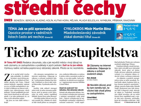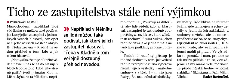 Nejvíce jsem se musel s určitou hořkostí usmívat poté, co jsem po vyjítí tohoto článku ve středočeské příloze MF DNES obdržel mail od mluvčí Úřadu pro ochranu osobních údajů, která mi psala, jak oni sami podporují zveřejňování záznamů ze zasedání zastupitelstev. Od úřadu, který naprosto nesmyslně dělal problémy radnicím, které záznamy dělaly už v minulosti, to bylo skutečně psaní, které bych nečekal. Ale berme to z lepší stránky: radujme se z toho, že je opět možné o něco lépe vidět do rozhodování radnic, starostů, zastupitelstev!