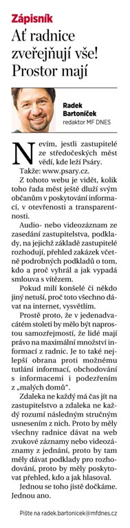 Jedna moje prosba: Požadujte po vedení vašich radnic, aby dávalo na internet záznamy ze zasedání zastupitelstev. TADY se podívejte, že to jde, že to není proti zákonům a některé radnice to i dělají!