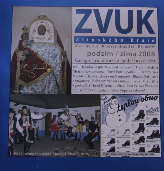 Později, až bude čas, vám napíši podrobně o obsahu i smyslu tohoto časopisu. Teď bych snad mohl podotknout, že duch naše kraje pocítíte nejvíce právě v tomto "médiu", nikdo jiný se mu nemůže rovnat, přispívají do něj výborní autoři, kteří píší na velmi zajímavá témata. Historie Slovácka (ale i Valašska), jeho minulost, osobnosti nynější i dřívější, témata, která jsou pro náš kraj zásadní, to vše je časopis ZVUK - časopis pro kulturu a společenské dění. Pokud jej čtete, dozvíte se mnoho nového, jste okouzleni informacemi i jazykem, přes který se k vám dostávají. A možná nakonec vysvětlení, proč ZVUK. Tedy, jsou to počáteční písmena čtyř měst, kolem kterých se časopis pohybuje: Zlín, Vsetín, Uherské Hradiště, Kroměříž.