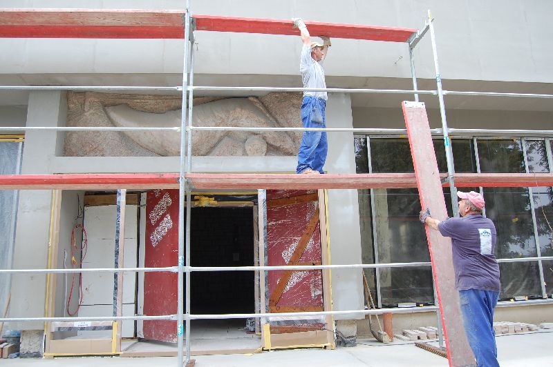 Jeho rekonstrukce jde totiž velmi rychle dopředu, venku už dělníci připravovali lešení na závěrečné nahození fasádní barvy (která je zřejmě dnes už nahozena), uvnitř byla rekonstrukce budovy prakticky hotová a za chvíli v ní už bude možné začít s instalací multimediální expozice, kterou by měli začít návštěvníci obdivovat někdy od začátku příštího roku.